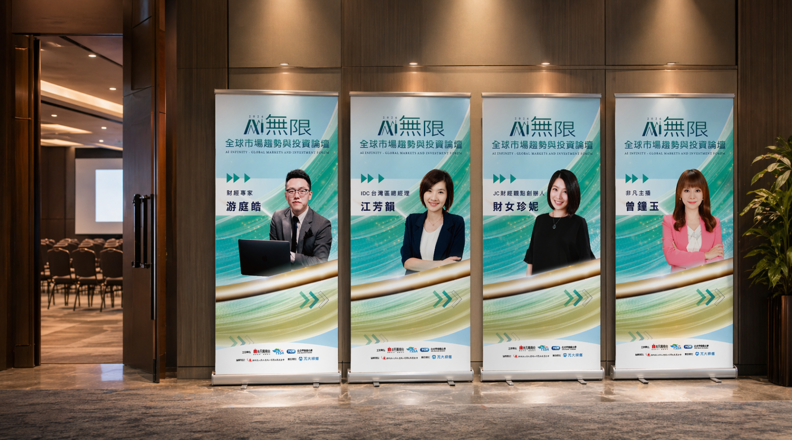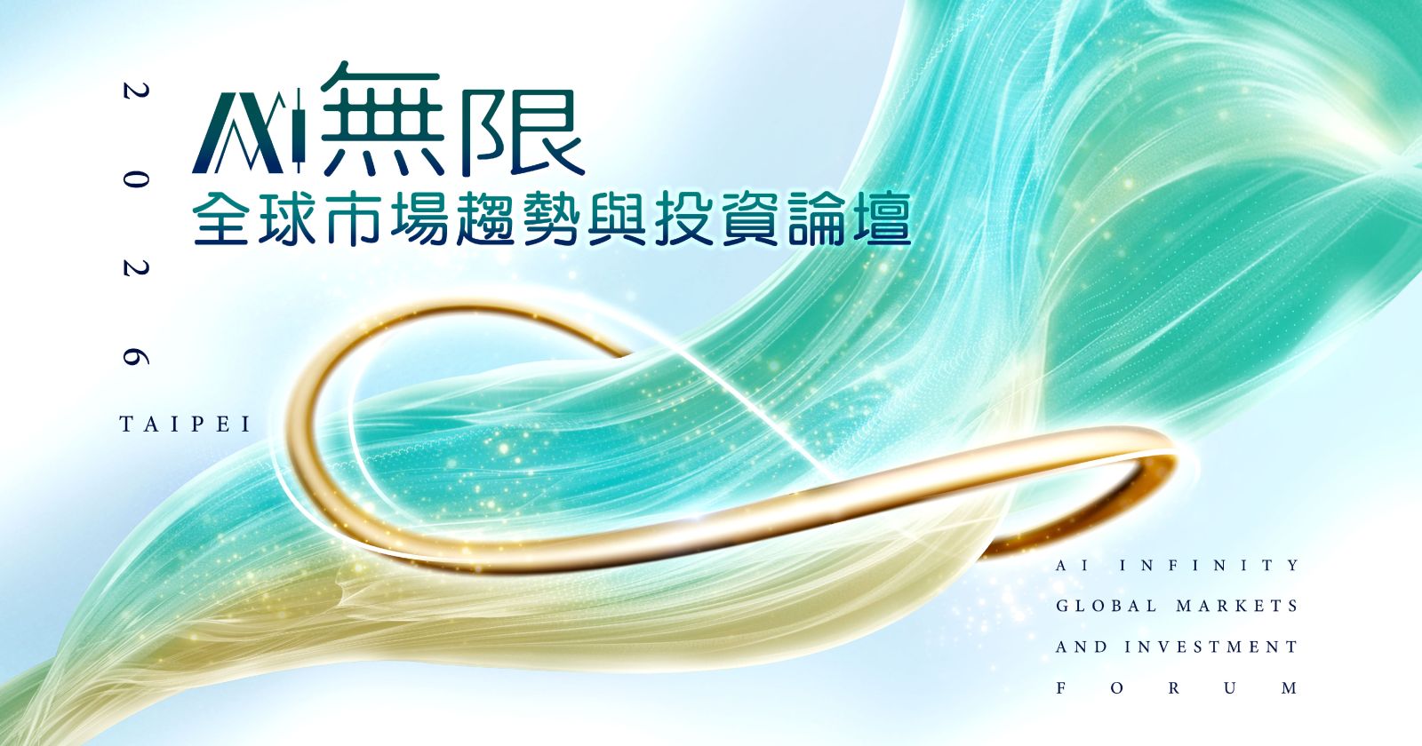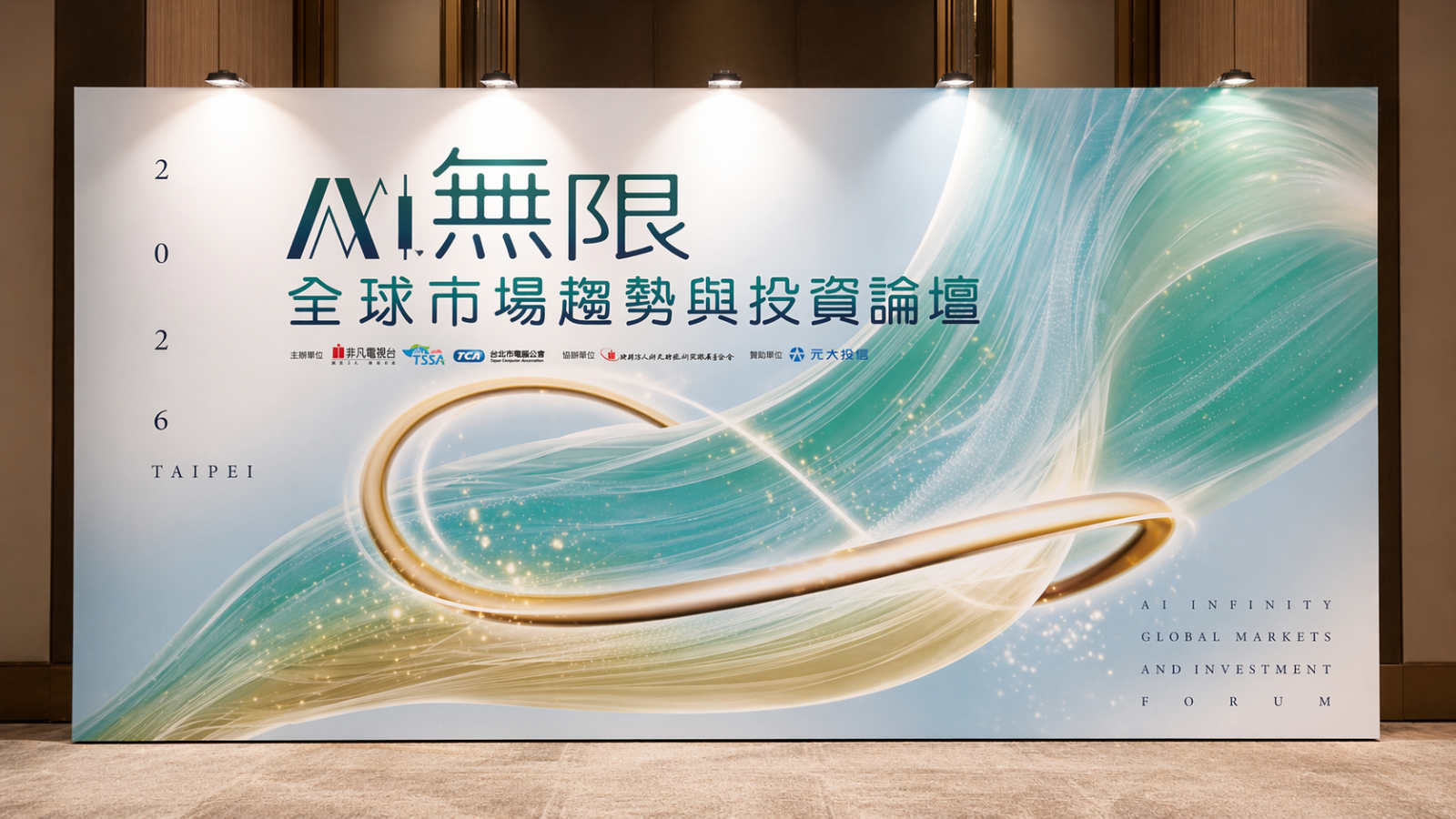 以「無限」為核心概念,透過流動光帶與環形金屬結構,象徵市場資本、科技與機會的持續循環與延展。色彩以青綠與金色交織,呈現理性與價值感並存的金融語彙;留白與光點則營造前瞻、開闊的國際視野,傳達論壇連結全球趨勢、引領投資未來的精神。